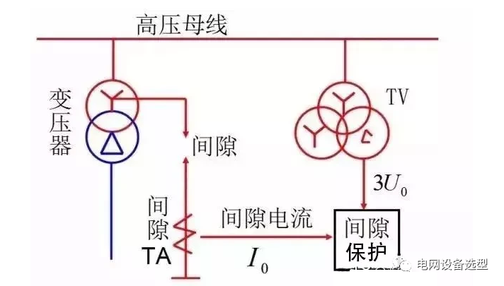 如下圖所示,為了避免由于過(guò)電壓從而將變壓器中性點(diǎn)絕緣性能損壞,所以,對(duì)于主變壓器中性點(diǎn)當(dāng)下最常采用的是裝設(shè)放電間隙的方法。此外,還在放電間隙回路裝設(shè)獨(dú)立的電流互感器,如此一來(lái)就組成了一個(gè)變壓器中性點(diǎn)放電間隙零序過(guò)電流保護(hù)。