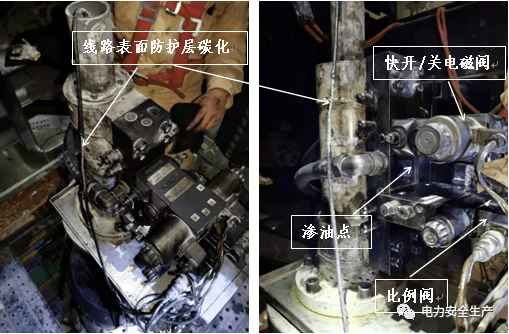 2號機組高旁閥控制機構快開/關電磁閥結合面滲油,附近有油煙,位移傳感器線路受油煙熏烤,線路表面防護層碳化,位移傳感器信號變壞點。