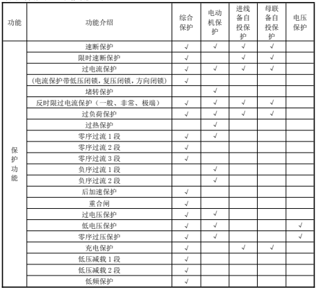 微機保護裝置功能配置表: